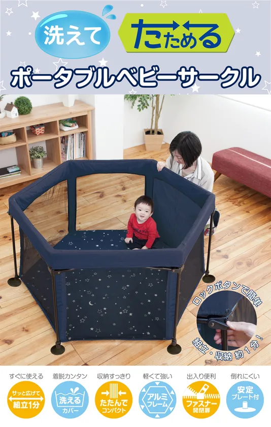 組立・収納約1分! サッと洗えて、サッとたためて持ち運びもできる 「洗えてたためるポータブルベビーサークル」発売