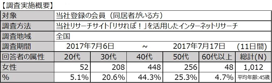 フィールド・クラウドソーシング事業を展開するソフトブレーン・フィールド株式会社(本社:東京都港区、代表取締役社長:木名瀬博)は、当社に登録している女性会員に家事についてのアンケートを2017年7月6日~7月17日に実施しましたので、その結果を報告いたします。 アンケート対象は、30 代~60 代の主婦を中心とする当社登録会員の内、同居者のいる方で、有効回答者数は1,012名(平均年齢45歳)でした。