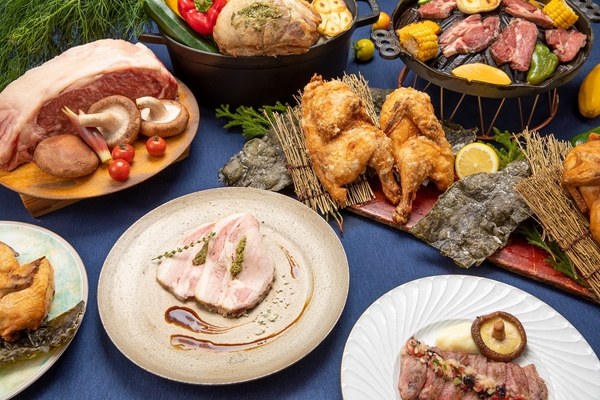 旬の野菜をふんだんに使った彩り豊かな料理や、ワインに合う料理が楽しめるハーフビュッフェレストランです。メインの料理は、オリジナルの南部鉄器と、熱した石で提供し、目の前で仕上げる肉や魚料理をローズマリーの香りとともに味わえます。