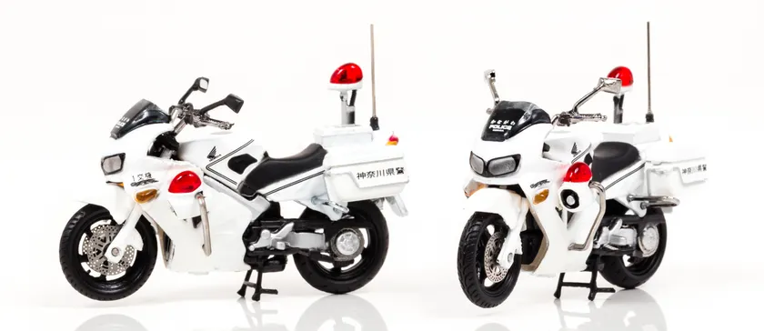 ホンダVFR800PはホンダがVFR800を白バイ専用グレードとして全国の警察に納めたバイクで、バータイプのハンドルや専用のメーター、スピーカー、赤色灯など専用装備が施されています。今回モデル化するのは神奈川県警察第一交通機動隊と第二交通機動隊に配備された2台になります。