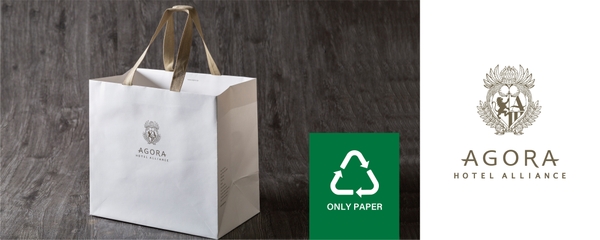 アゴーラ ホテル アライアンスでは、10年ぶりに紙袋のデザインを一新し、100%リサイクル可能な紙袋として循環型社会を目指します。新しいデザインとして、プロダクトに考慮し、シンプルなデザインで機能性を重視しました。白を基調とした幅の長いデザインで、持ち手の紐は紙を高密度に編んで作られており、十分な強度もあります。布製の紐のようにしなやかで優しい手触りは、見た目も質感も高級感あるモダンでシンプルな印象です。