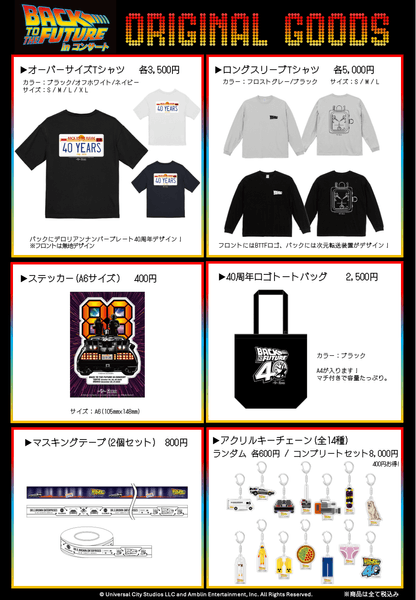 1985年公開「バック・トゥ・ザ・フューチャー」の第1作目をノーカットで大スクリーンに上映し、舞台上では80名を超えるフルオーケストラが音楽を映画に完全シンクロさせて生演奏でお届けする「バック・トゥ・ザ・フューチャー」inコンサート。いよいよ10月24日(金)〜26日(日)に開催される東京公演にて、公演オリジナルグッズ販売が決定しました!ラインナップには40周年を記念したロゴやデザインがあしらわれたアニバーサリーイヤーにぴったりのアイテムが多数登場。