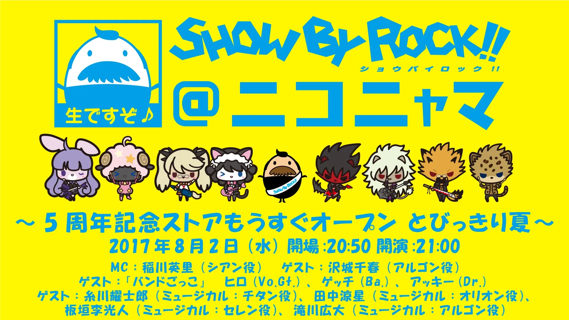 ニコニャマでは、ゲームアプリ「SHOW BY ROCK!!」をはじめ、5周年記念ストア、ライブイベント“3969”SUMMER Fes.2017、ミュージカルなどの最新情報のほか、ゲスト出演する「バンドごっこ」による生演奏企画など超豪華スペシャル企画を盛りだくさんでお送りする予定です!