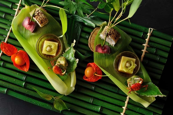 四季折々の山川の恵みをふんだんに使用している夕食「山の懐石」。素材本来の味わいを生かし、旨味が引き立つ調理法や、食材や調味料の相性を見極める「食の調和」を大切に仕立てた懐石料理です。栄養豊富な旬の食材をバランスよく味わうことで、身体を調えることができます。