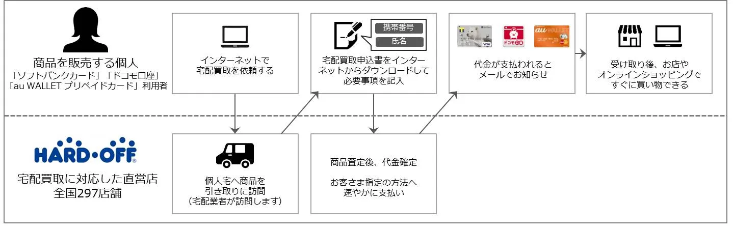 「支払代行サービス」のリリースにあわせ、「ハードオフグループ」(運営会社:株式会社ハードオフコーポレーション)が展開する宅配買い取りに、本サービスを導入いただくことが決定しています。2017年8月2日から、全国297店舗の直営店※4が受ける宅配買い取りサービスの支払い手段に追加されます。これにより、商品の査定後速やかに、買い取り代金の支払いができるため、支払い手続きの簡略化と利便性の向上が可能になります。