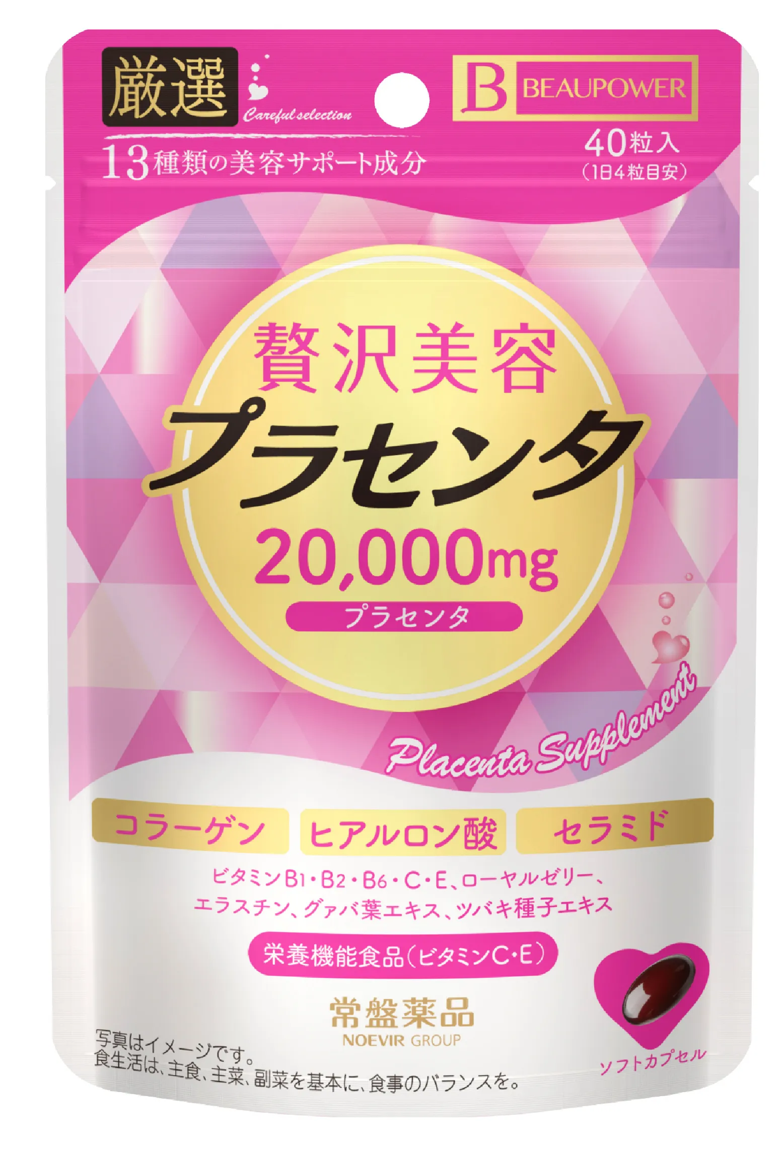 サフラワー油、プラセンタエキス(豚由来)、コラーゲンペプチド、ビタミンE含有植物油、ローヤルゼリー末、グァバ葉エキス末、ツバキ種子エキス末、エラスチン加水分解物、セラミド含有米エキス末/ゼラチン、グリセリン、ビタミンC、レシチン(大豆由来)、グリセリン脂肪酸エステル、コメヌカロウ、カラメル色素、ヒアルロン酸、ビタミンB1、ビタミンB6、ビタミンB2