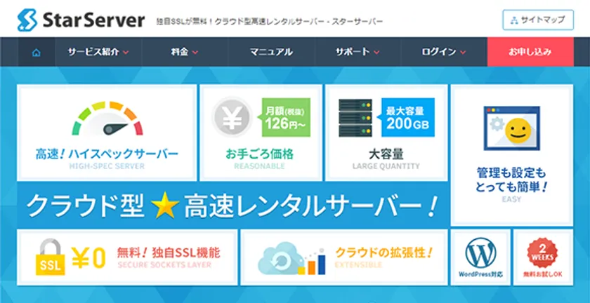『スターサーバー』は高速環境にこだわったレンタルサーバーサービスです。高性能CPU&大容量メモリを搭載した最新サーバー環境が月額126円から利用可能で、WordPressなどのCMSやWebサイトが快適に動作する環境を提供します。