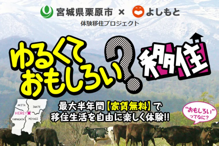 2017年8月3日 16:00宮城県栗原市と株式会社よしもとクリエイティブ・エージェンシー(以下:よしもと)は、栗原市内の建物に2017年10月からの約半年間、家賃無料で体験移住することができる「ゆるくておもしろい?移住」プロジェクトを開始します。このプロジェクトは、2015年に福井県鯖江市が行った「ゆるい移住」プロジェクトをモデルに、「栗原市移住定住情報発信・地域コンテンツ創造ワークショップ事業」として行います。