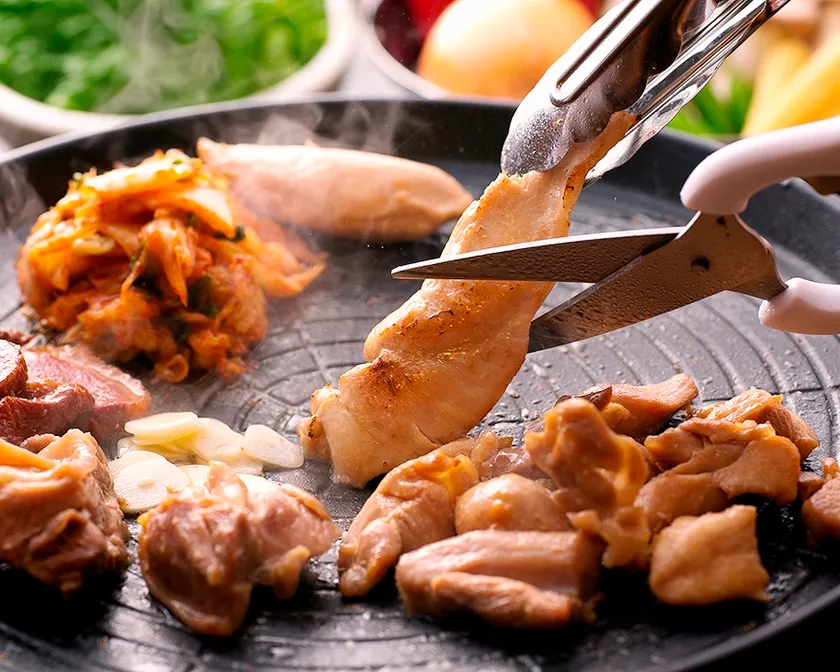人気のサムギョプサルを鶏専門店が自慢の鶏を使用し「鶏ギョプサル」として開発しました。ヘルシーで上質な鶏肉をお客様自身が卓上で焼き、ナムルや笹切りネギなどの薬味と6種類のタレを新鮮なチシャ菜で包んでお召し上がりいただけます。
