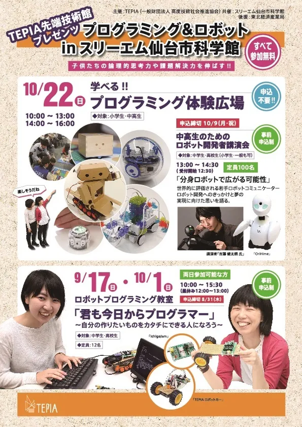 2017年8月10日 10:00TEPIA先端技術館では、今秋、新たな取り組みとして、スリーエム仙台市科学館において「TEPIA プログラミング&ロボット inスリーエム仙台市科学館」を開催します。「プログラミング」「ロボット」をテーマにしたイベントを開催し、子供たちの論理的思考力や課題解決力の育成につなげます。