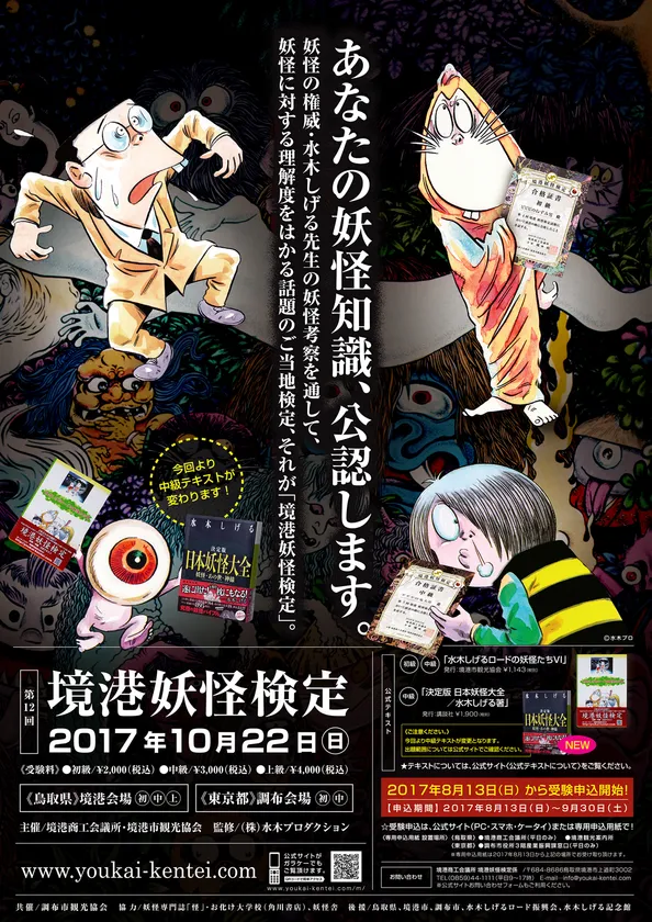 2017年8月10日 10:30境港商工会議所および境港市観光協会は、2017年10月22日(日)に境港会場(鳥取県境港市)と調布会場(東京都調布市)で実施する『第12回境港妖怪検定』の受験申込受付を8月13日(日)に開始いたします。