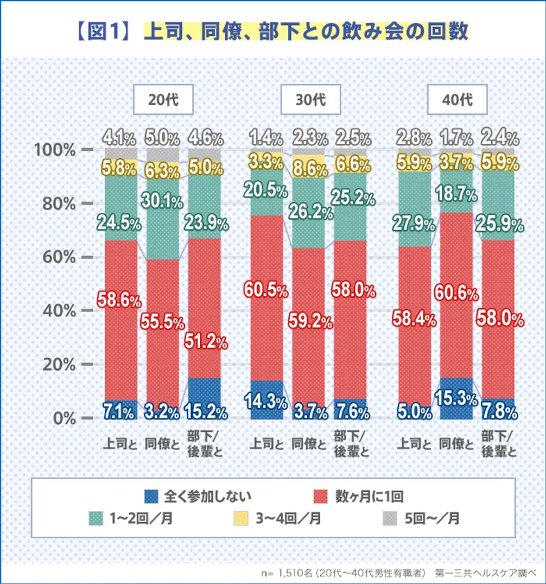 1. 20代~40代の男性有職者1,510名を対象にアンケートを行ったところ、どの年代においても「数ヶ月に1回」の人がもっとも多いことがわかりました。また、同僚に比べて、上司や部下との飲み会には「全く参加しない」と回答した人が多い結果となりました【図1】。