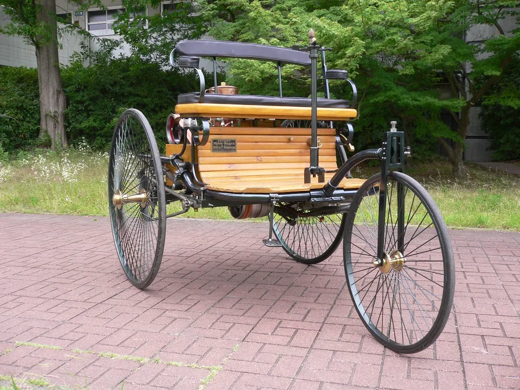 ガソリン/1886年/カール・ベンツが造った世界初のガソリン自動車。馬車代わりの乗り物として登場、3輪車・棒ハンドル。時速15kmで走行可能だった