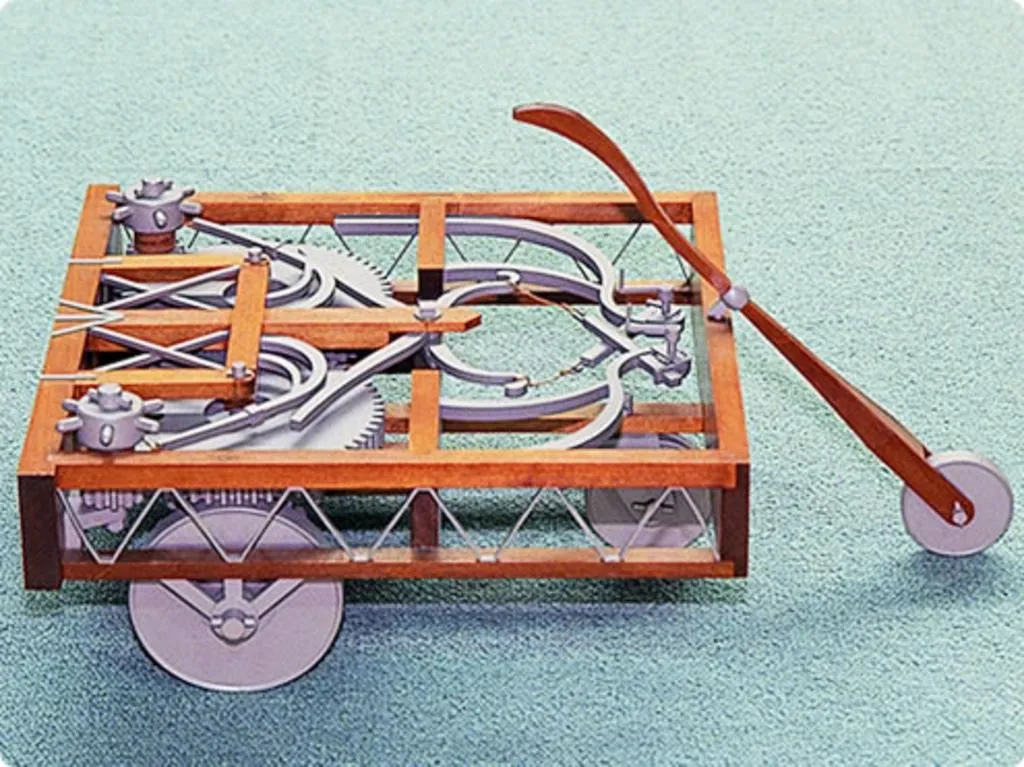 1480年/レオナルドダヴィンチが残したぜんまい動力で走る車の設計図からの模型。動力伝達装置やステアリング機構はあるが原動機ではない