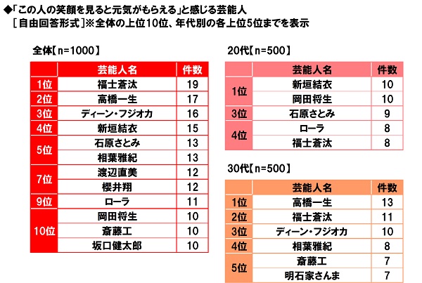年代別にみると、20代の回答では、1位は同数で「新垣結衣さん」と「岡田将生さん」、3位は「石原さとみさん」となり、トップ3に女性芸能人がランクインしました。20代のビジネスウーマンは、同性の笑顔からも励まされているようです。