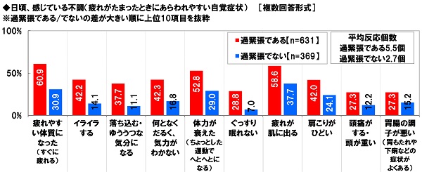 また、過緊張の状態にある人の9割強(92.9%)は、この“慢性疲労”の状態にあることがわかりました。気が休まらない過緊張の状態にあると、疲れやすい体質になってしまい、それが、休んでも疲れがとれない“慢性疲労”へと繋がってしまうようです。