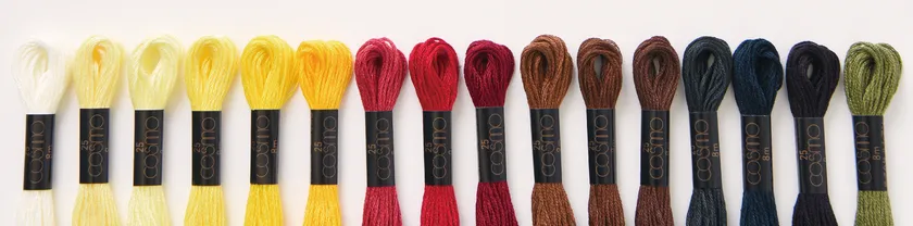 原料、製法、品質にこだわり、シルクのように輝く光沢に、ソフトな風合い、そして美しい発色を持つコスモ刺しゅう糸は、取扱い当初より一貫してひとつの国内染色工場で染色を行うことで、色ぶれが多いとされる刺しゅう糸においては、極めて色ぶれが少ない糸として高い支持を得ています。