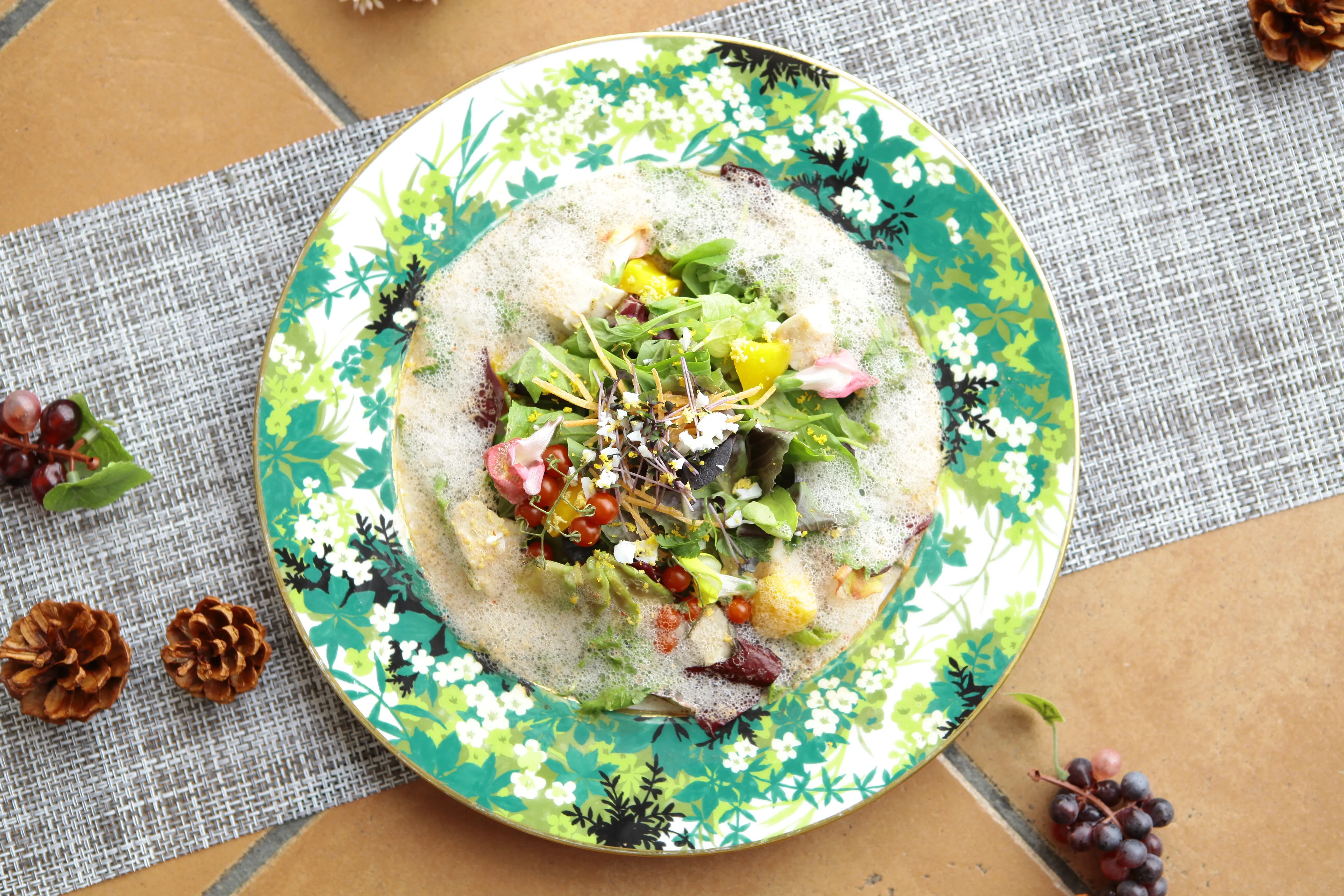 グリルチキン、野菜、フルーツをざっくりと混ぜ合わせた主食にもなるパワーサラダです。もこもこに泡立てたトマトの泡をドレッシングとして贅沢に盛り付けました。クセのないまろやかな風味が全ての材料を包み込み、美味しく仕上げます。