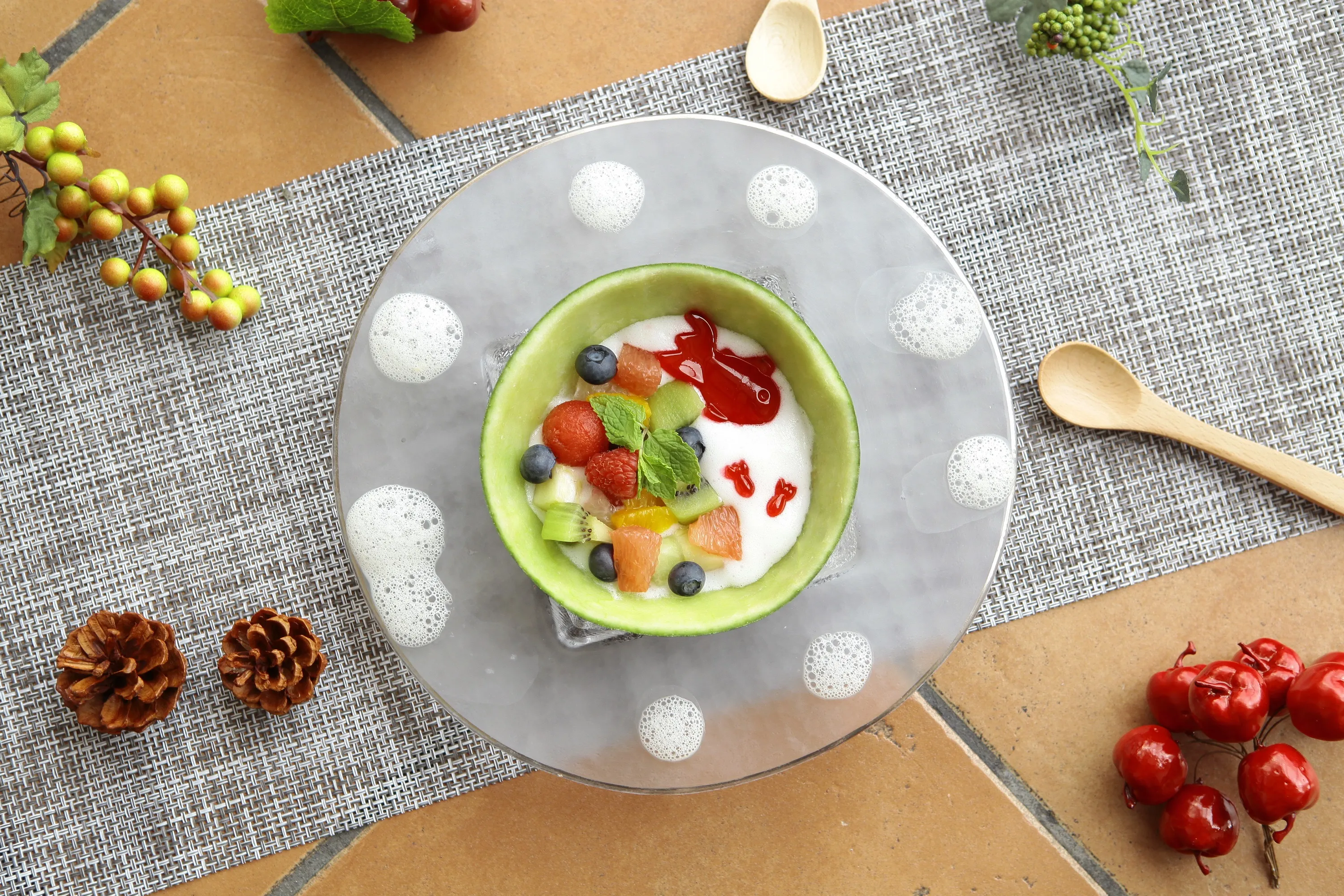 くりぬいた西瓜を金魚鉢にみたてた器の中には、色とりどりのフルーツが浮かび、金魚のゼリーが泳ぎます。盛り付けられたふわふわの泡と一緒に涼しげなスイーツをお楽しみください。
