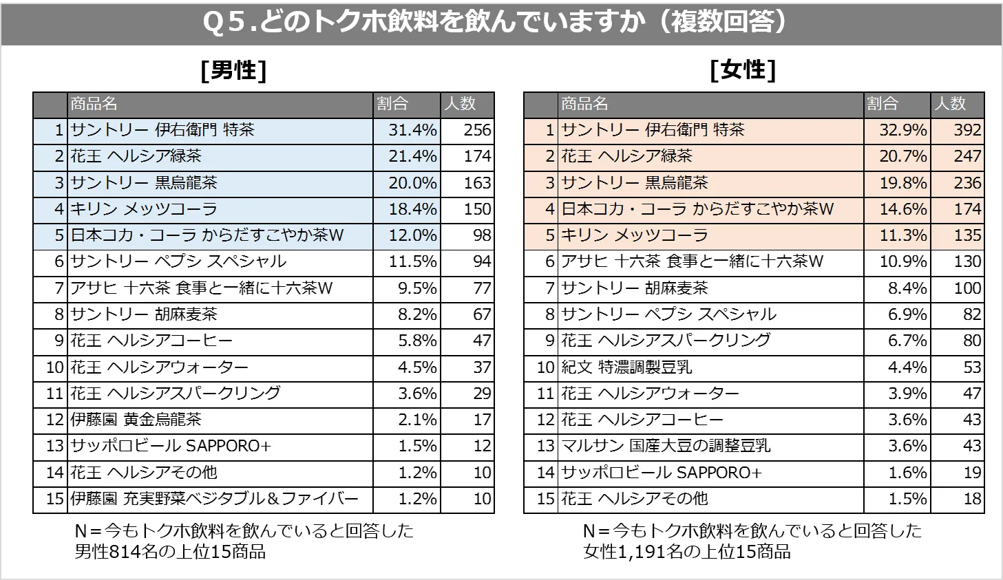 2位は「花王 ヘルシア緑茶」(男性21.4%・女性20.7%)、3位は「サントリー 黒烏龍茶」(男性20.0%・女性19.8%)であり、お茶系飲料の人気が高いことがわかりました。