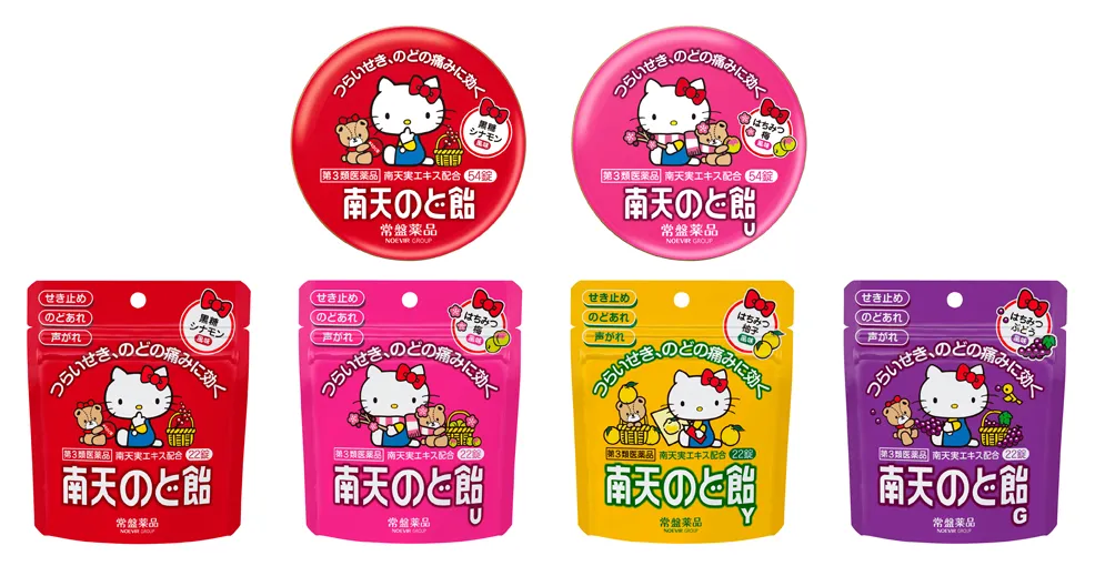 1968年の発売以来、つらいせき・のどの痛みに効く医薬品ののど飴として、“効き目”と“風味”にこだわり、お子様からご年配の方まで広くご愛用頂いている『南天のど飴』が、長年愛され世界的に人気のキャラクター“ハローキティ”とコラボレーションしました。風味ごとでそれぞれ異なるイラストを楽しめます。