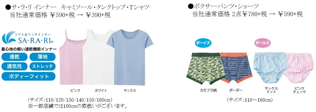 また、台風シーズンの新学期にうれしい「はっ水バッグ」や速乾インナーまで、夏のお役立ちアイテムが満載。