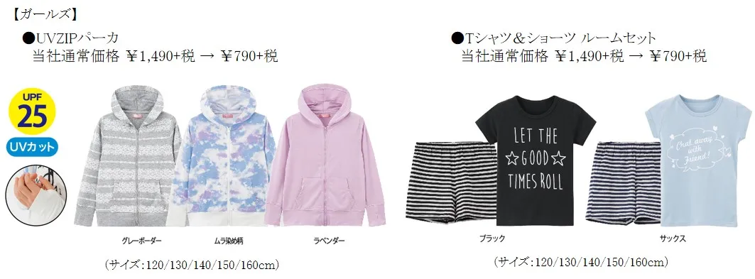 着替え用に何枚でも欲しいTシャツやショーツのほか、海やプールには欠かせない「UVラッシュガード」、旅行や帰省におすすめのかわいいルームウェアなど、豊富な品揃え。