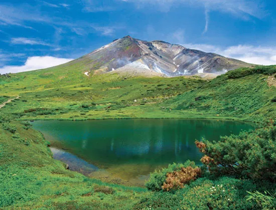 大雪山は、最高峰の旭岳をはじめとした北海道中央部にある山々の総称。旭岳の中腹には、鏡池、擂鉢(すりばち)池、姿見の池、そして噴気孔といった見どころが多く、7月から8月には高山植物のお花畑が楽しめることも。日本一早く紅葉が見られることでも有名です。