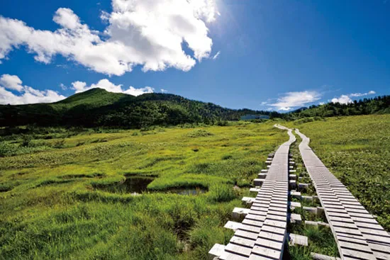 登山トレッキングコースは片道3時間ほどの初級から9時間以上かかる上級まで多数あり、本格的な登山も楽しめます。山頂にある月山神社本宮でしか買えないお守りや御朱印(ごしゅいん)があり、登頂の記念品として人気があります。八合目付近の弥陀ヶ原(みだがはら)湿原では高山植物が豊富で、貴重な動物も多数生息。残雪が多い月山では、4月上旬から7月末まで夏スキーを楽しめます。