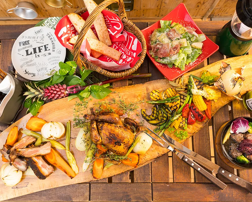 人気メニューは牛ハラミを刻んだ玉葱に丸1日漬け込み繊維を究極まで柔らかくした「バベット(牛ハラミ)のアヒージョ」、三段重ねの丸太皿に野菜、ビーフ、トルティーヤなどを盛り込み挟んでカレーソースで食す「ローストビーフのマッサマンカレー」、オリジナルスパイスを使ったダッチオーブンで提供する「丸鶏のロースト」etc...オリジナリティー溢れるグリル料理をお楽しみいただけます。