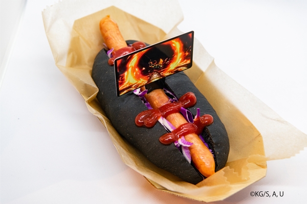 無限列車と同化した魘夢の背骨をイメージしたホットドッグに、ヒノカミ神楽 碧羅の天のピックをトッピングした一品。