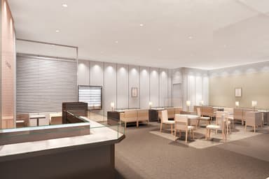移転を機に、アイプリモのデザインコンセプト「Fortune Diamond」を体感できる店舗として、こだわりの外観や店内設備を実現しています。アーチ状のエントランスをくぐると開放的で明るい空間が広がり、店内には結婚指輪と婚約指輪を同時に比較検討できる個別ブースを用意。お客様が快適に指輪選びをすることが出来るような空間になっております。