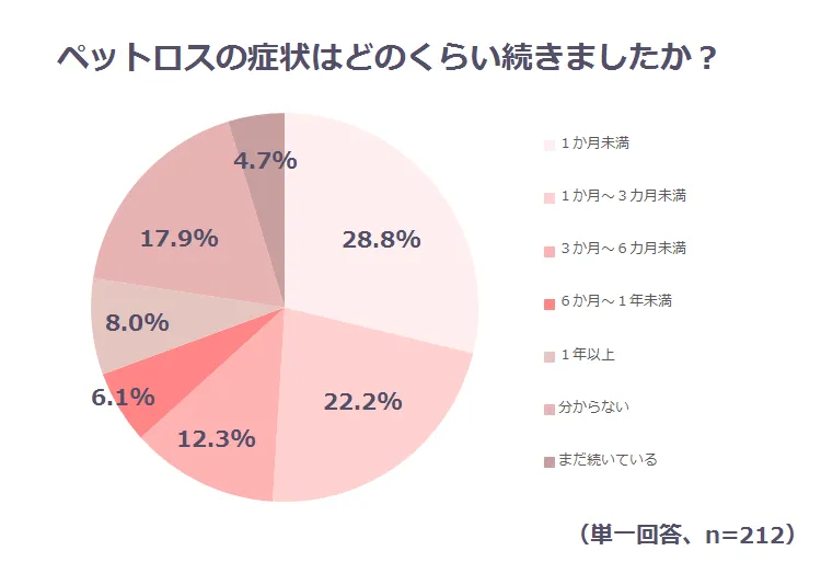 ペットロスの症状がどれくらいの期間続いたか、という質問では、「3ヶ月未満」という回答が51.0%を占めています。しかし、中には「外に出られなくなる」という深刻な症状が半年以上続いたケースも見られました。