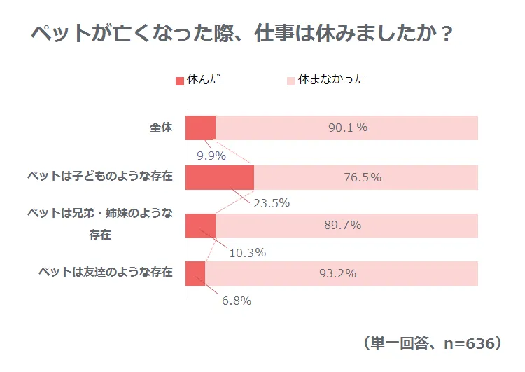 ペットを亡くしたときに仕事を休んだかどうかを調査した結果、「休んだ」という回答が9.9%となりました。特にわが子同然のように可愛がっていた方はお休みされていた割合が高く、23.5%の方が仕事をお休みされているという結果が出ました。