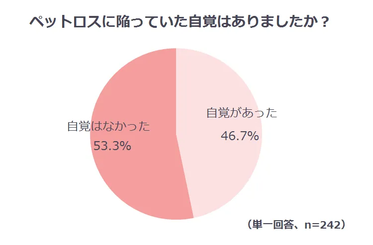 ペットロスの症状が現れた人のうち、53.3%がペットロスに陥っていることを自覚していなかったことが判明しました。ペットロスという言葉が一般的に普及してきているにもかかわらず、半数以上が無自覚であることがわかりました。