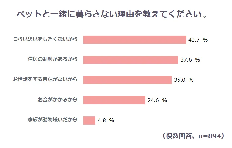 現在、ペットと一緒に暮らしていない理由として最も多かったのは、死別などのような「つらい思いをしたくないから」が最多で40.7%となりました。次いで「住居の制約があるから」という回答が37.6%、一人暮らしだったり小さな子どもがいたりで「お世話をする自信がないから」という回答が35.0%となりました。