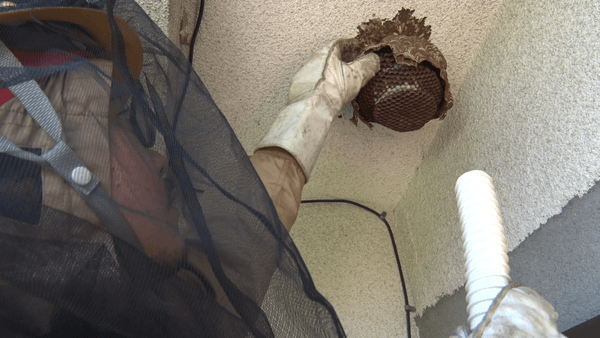 依頼先の山梨県甲州市の住宅を訪れた望月さん。2階の軒先に巣がぶら下がっていました。数種類いるスズメバチの中でも警戒心が強く、凶暴性も高いキイロスズメバチ。巣はこのまま放っておくと3倍にも大きくなる危険な状態です。