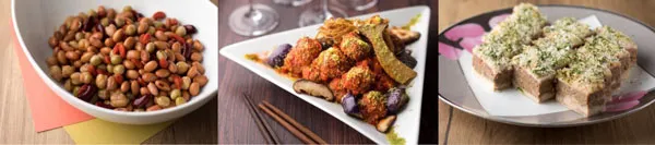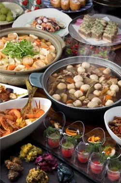 紫いものフラン/ウニ・イクラ・メンタイコのカッペリーニ/海の幸のマリネ/茄子&銀杏&ハムのパンツァネッラ/アサリの香草レモンバター/白身魚のワイン蒸し グラタン仕立て/本格四川風マーボー豆腐/上海風黒酢豚/ストーブ鍋 スパイシー赤カレー・黒カレー など