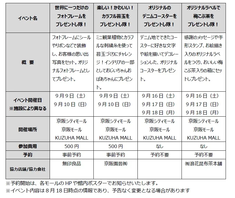 京阪沿線3つのショッピングセンターである京阪シティモール、京阪モール、KUZUHA MALLをご利用いただくお客様に、「敬老の日」に併せて、おじいちゃん、おばあちゃんへの感謝の気持ちや大好きな気持ちを伝えるためのプレゼントをつくるワークショップイベントを開催致します。手づくりにこだわった世界にひとつのプレゼント、そして思い出に残る1日をプロデュースします!