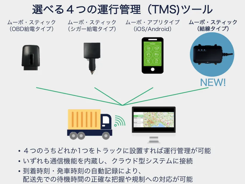 「MOVO」の運行管理ツールは、「ムーボスティック OBDIIタイプ」「ムーボスティック シガーソケットタイプ」「ムーボ・アプリ(スマホアプリ)」に続き、本商品で全4種類となります。
