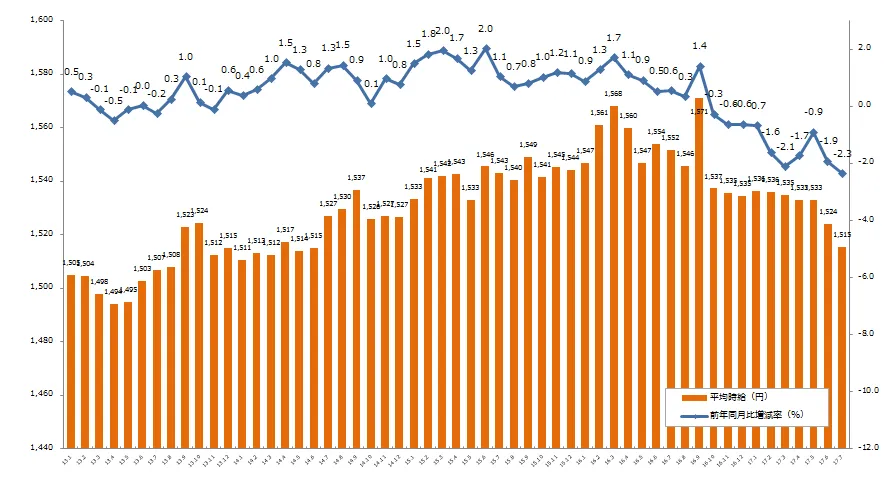 2017年7月度の派遣平均時給は1,515円、 10ヶ月連続で前期比マイナス。