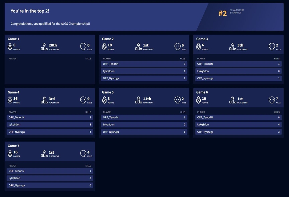 6試合目も見事チャンピオンを獲り、総合3位と大差30ptをつけ、総合2位となり世界大会『Apex Legends Global Series 2022 Championship』への切符を手にしました。