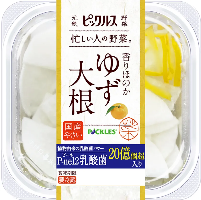当社独自の乳酸菌「P-ne12乳酸菌」(※加熱菌体)を20億個超配合した浅漬です。今話題の乳酸菌を、漬物で手軽に召し上がっていただけます。国産のゆず皮を使用した、甘口の浅漬です。箸休めにぴったりな食べやすい味付けに仕上げました。原料の大根は国産を使用しています。