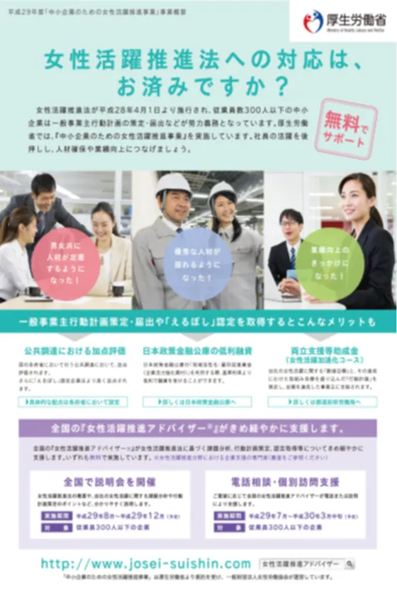 中小企業の女性活躍推進の取組みを支援することを目的として、『女性活躍推進法』に基づく課題分析、行動計画策定、認定取得等について全国の中小企業を対象に説明会の開催や電話相談、企業訪問等を実施しています。