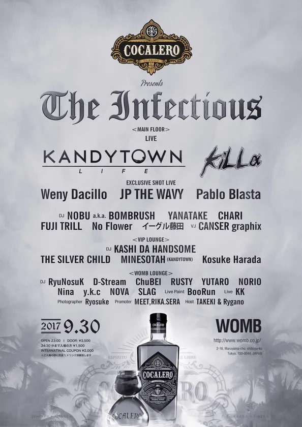 2017年8月23日 12:00The Infectious実行委員会は、「KANDYTOWN」や「kiLLa」など、2018年のHIPHOPを担う注目アーティストが一堂に介するビッグパーティ Cocalero presents『The Infectious』を、渋谷WOMBにて2017年9月30日(土)に開催いたします。