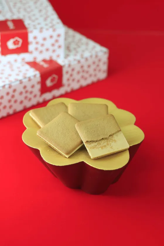 黒蜜入りの生地できなこチョコを挟むことで桔梗信玄餅風味を再現しました。特にきなこを練りこんだチョコは口どけにこだわりました。