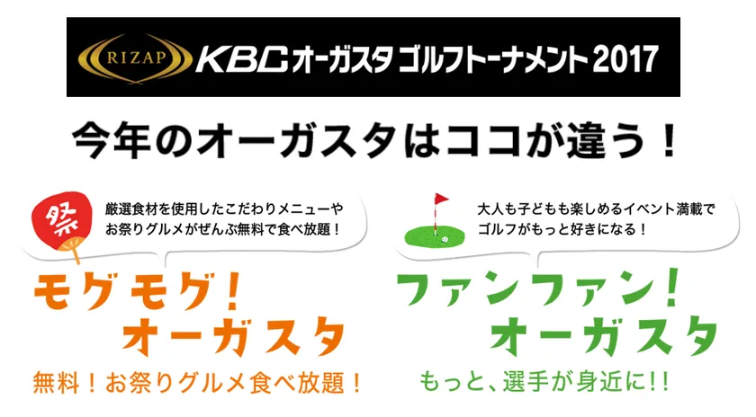 RIZAP協賛「RIZAP KBCオーガスタゴルフトーナメント2017」 8月24日より開始! 人気グルメが無料食べ放題のほか、 選手を身近に感じられるイベントなど盛りだくさん