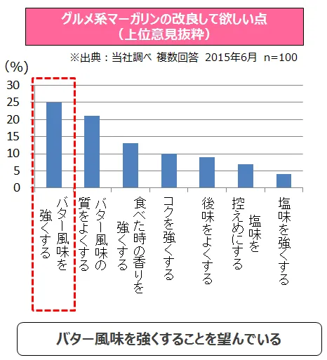 グルメ系マーガリンユーザーに改良して欲しい点を調査したところ、バター風味を強くすることを望んでいることが分かりました。
