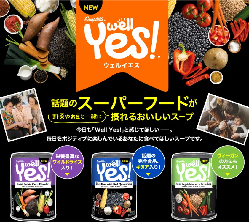 Well Yes!は米国で2016年に発売、簡単においしくスーパーフードを摂ることができる製品として、キャンベル製品の中でも、より美容と健康に気をつかうセレブやヨギー(ヨガを行う人々)を中心に大人気のラインナップです。