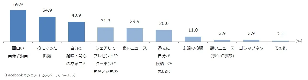 ・シェアする内容は、「面白い画像や動画」69.9%、「役に立った話題」54.9%、「自分の趣味・関心のあること」43.9%が上位3つとなっており、画像や動画が拡散のポイントとなっていることが判明。 <図2>